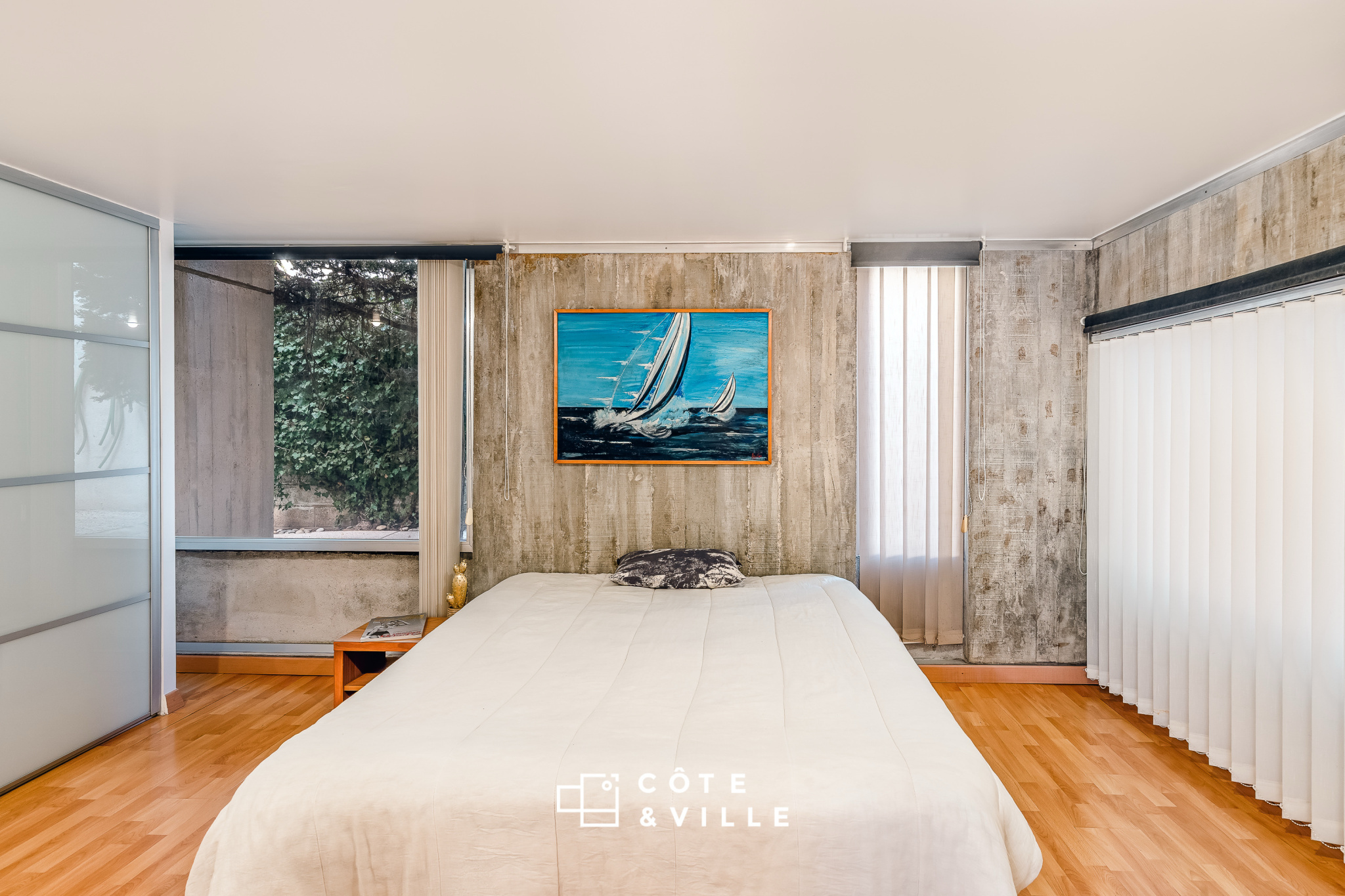 Ce projet architectural en béton banché sublimé par les actuels propriétaires passionnés de design, abrite un espace de vie commun baigné de lumière et desservi par un escalier dans le pur style de l’architecte. La cuisine est équipée.