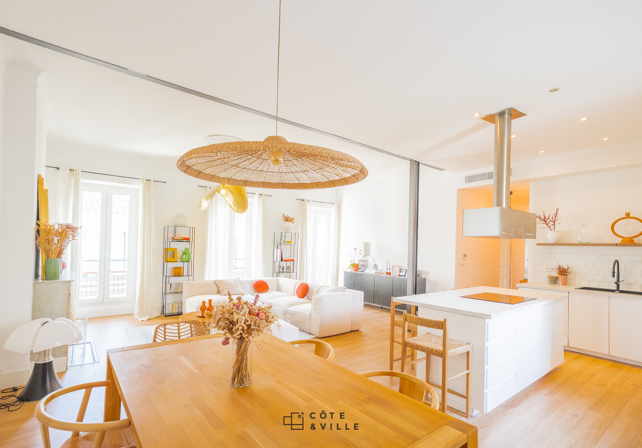 L’espace de vie, baigné de lumière, offre un grand séjour d’environ 46m2 avec cheminée fonctionnelle, une cuisine ouverte entièrement équipée et une salle à manger .