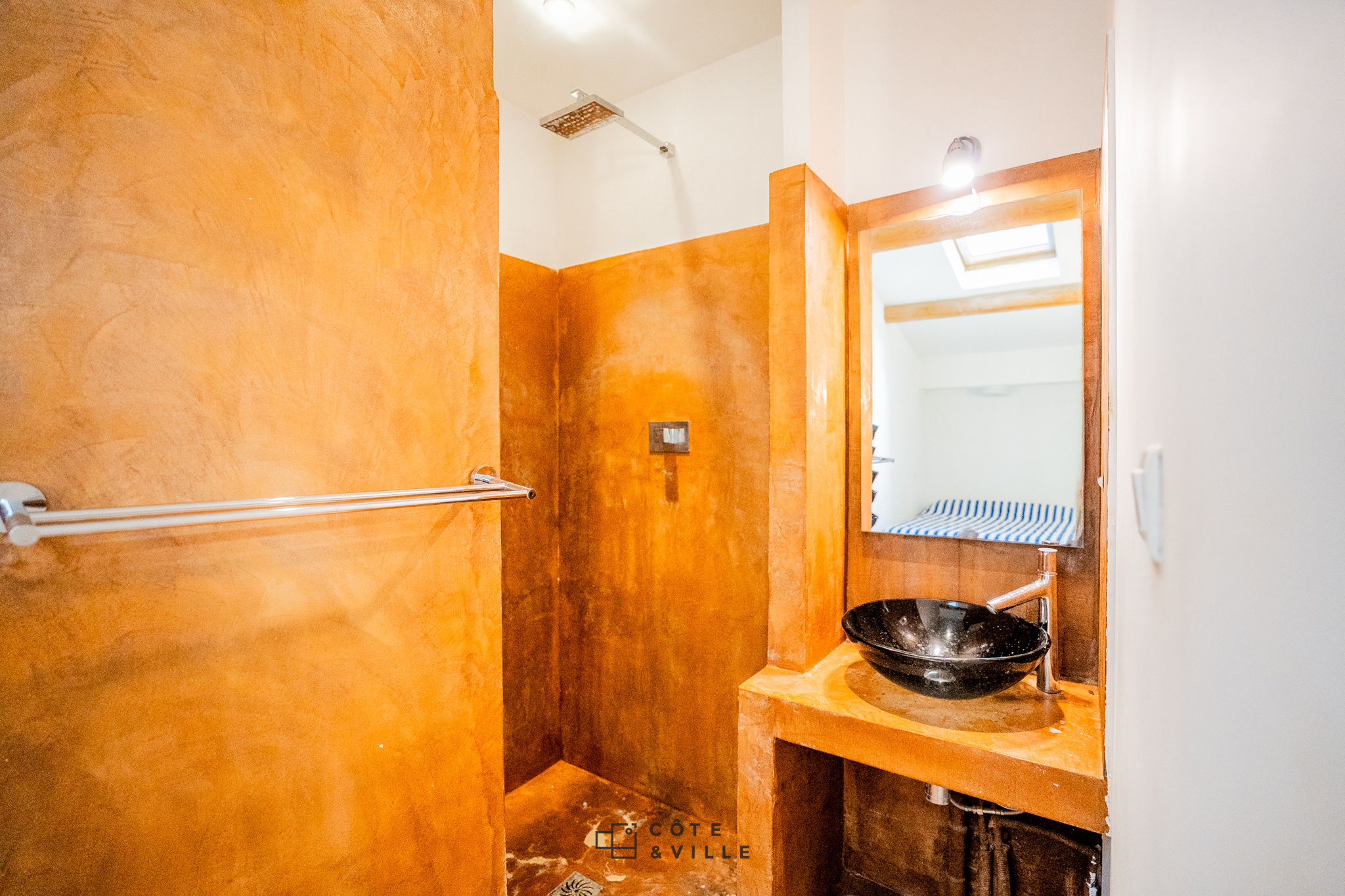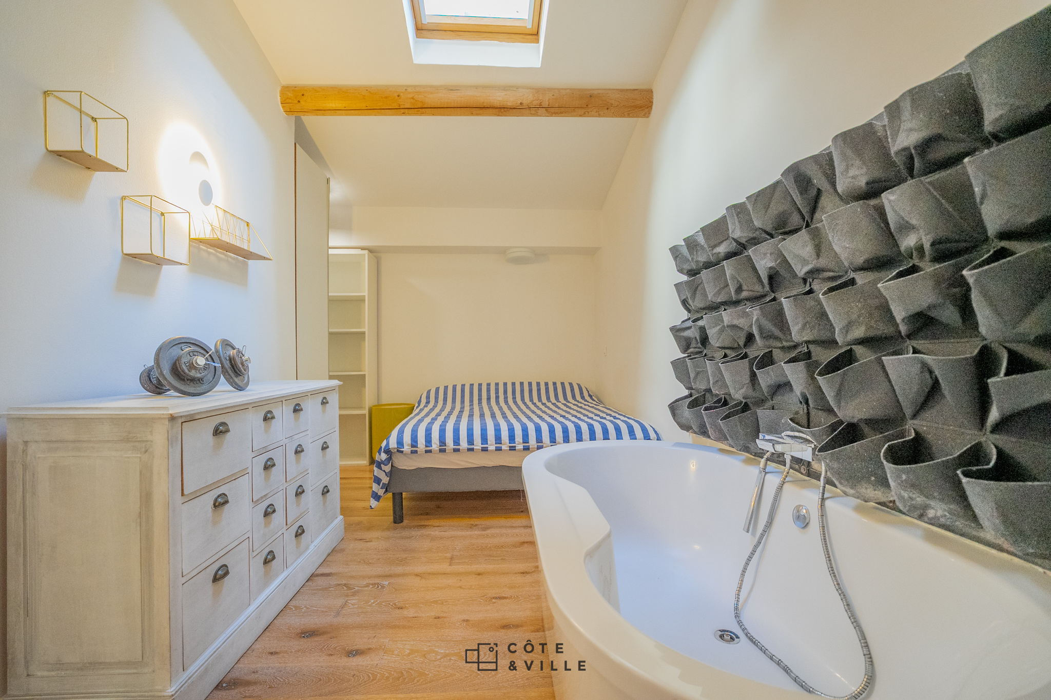 A 200m de la plage des Catalans, en passant la porte d’entrée nous découvrons un espace de 40m2 avec une belle hauteur sous plafond, le coin repas ouvert sur la cuisine, et le salon chill savamment placé sous 3 Vélux.La suite parentale de 17m2 également sous Vélux est dotée d’une baignoire, une douche et un dressing.