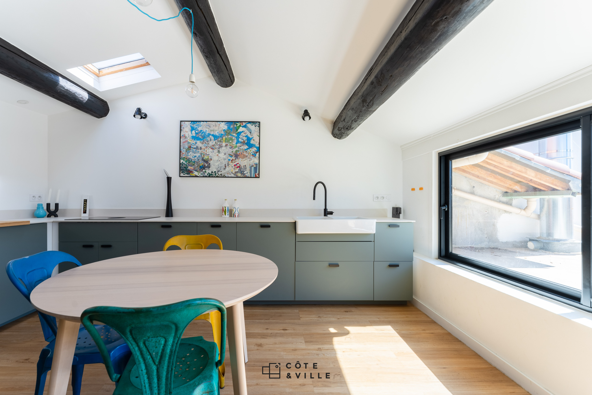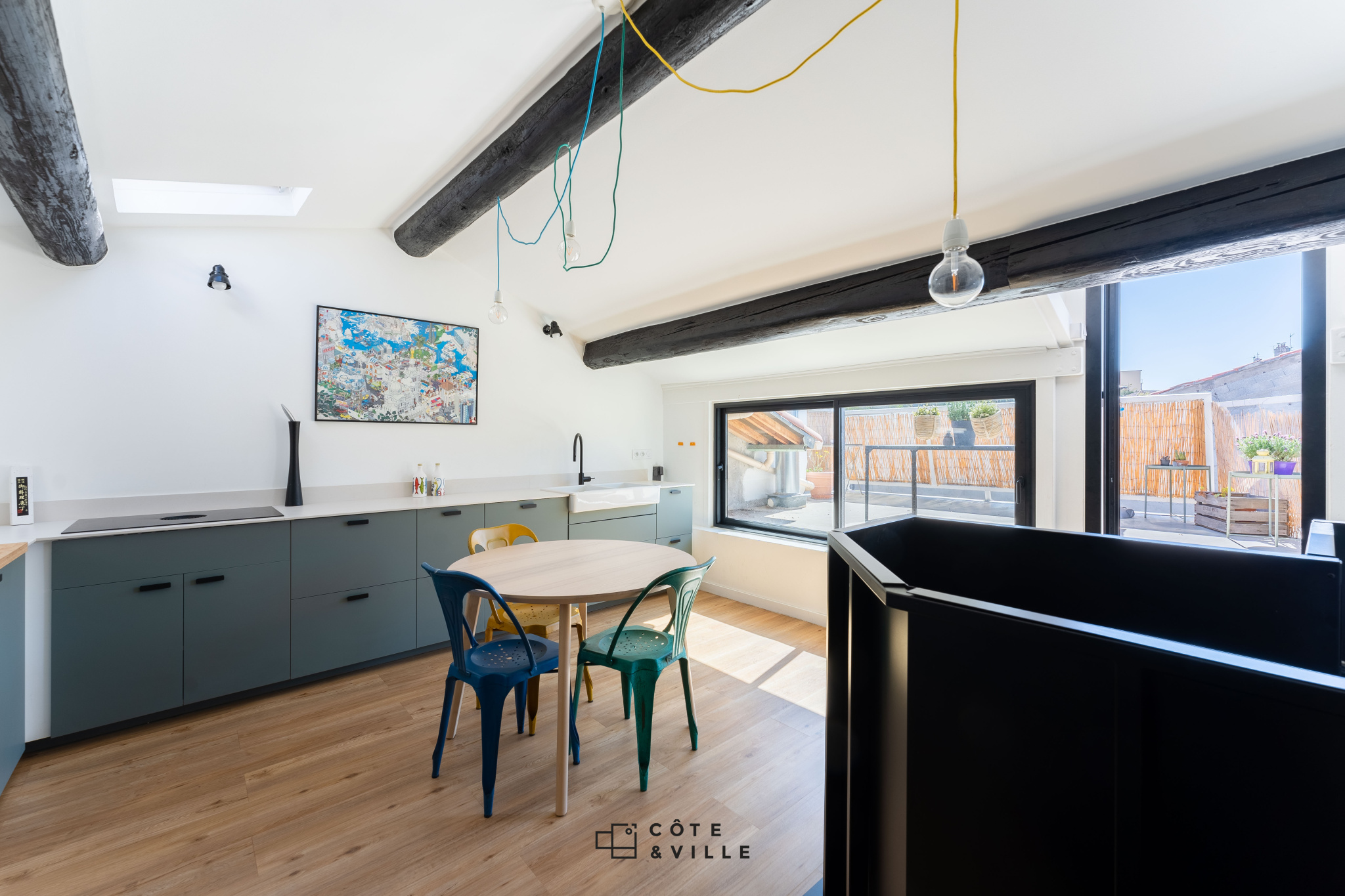 A l’étage, une cuisine entièrement équipée donnant sur une terrasse de 35m2 au calme, avec une vue dégagée sans vis à vis.