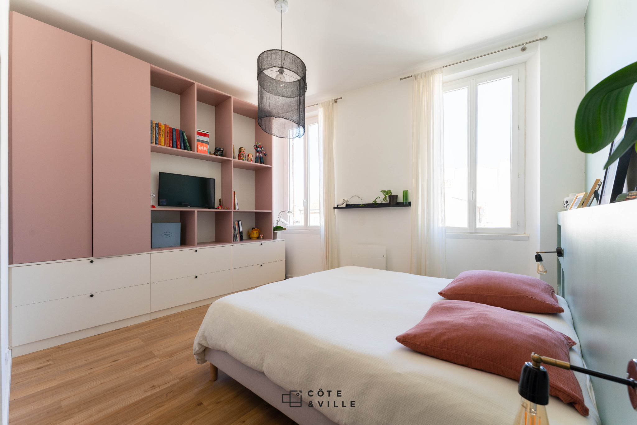 Coté nuit on y trouve deux grandes chambres aux volumes généreux, avec de nombreux rangement fait sur mesure, une grande salle de bain avec baignoire-douche et d’un wc séparé.