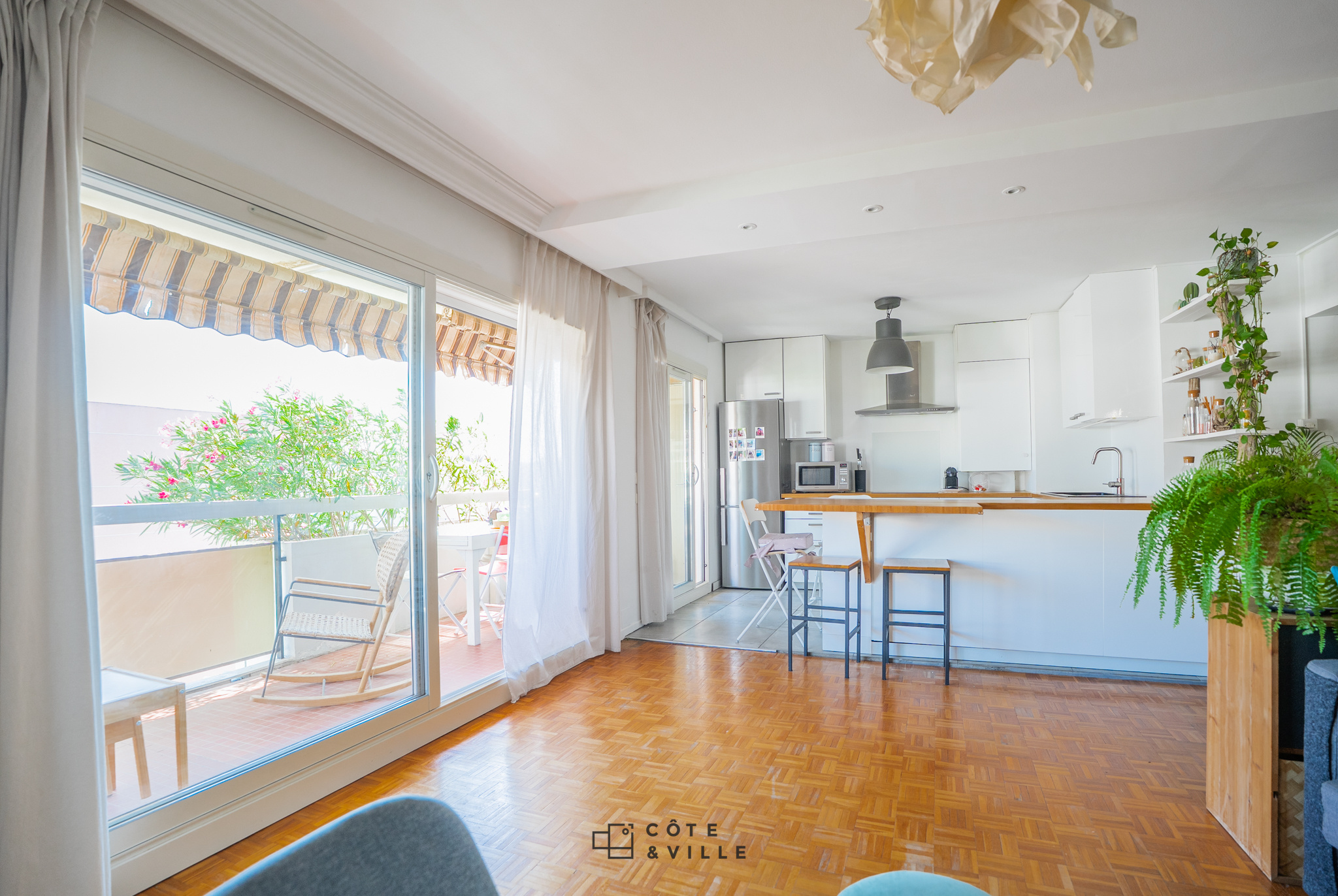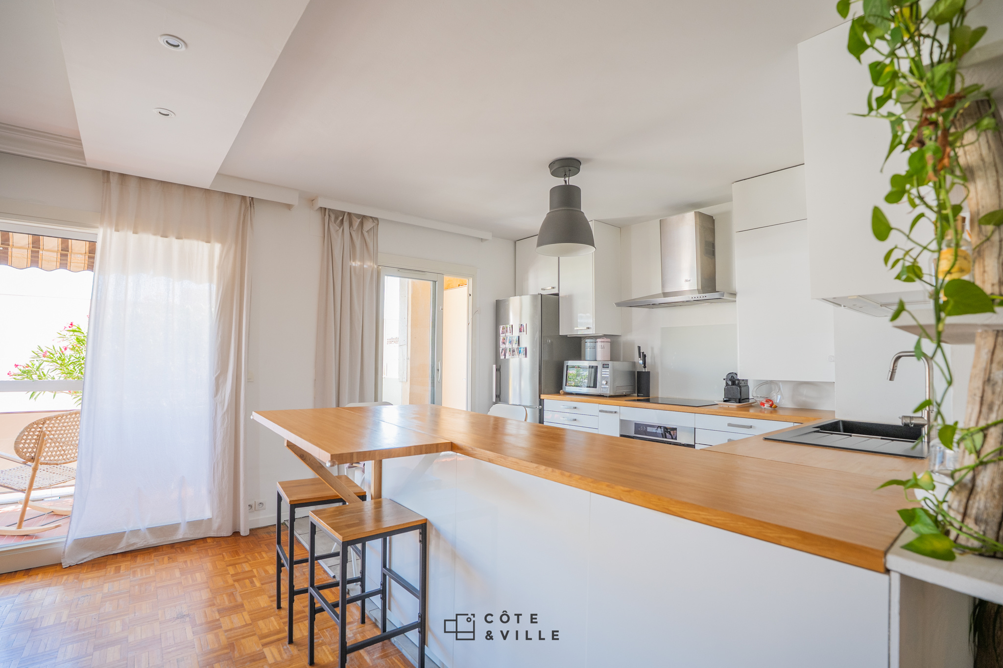 Le séjour de 40m2, lumineux et exposé SUD, ouvert sur une cuisine américaine toute équipée, dispose d’une grande terrasse en L avec une vue sublime et dégagée.