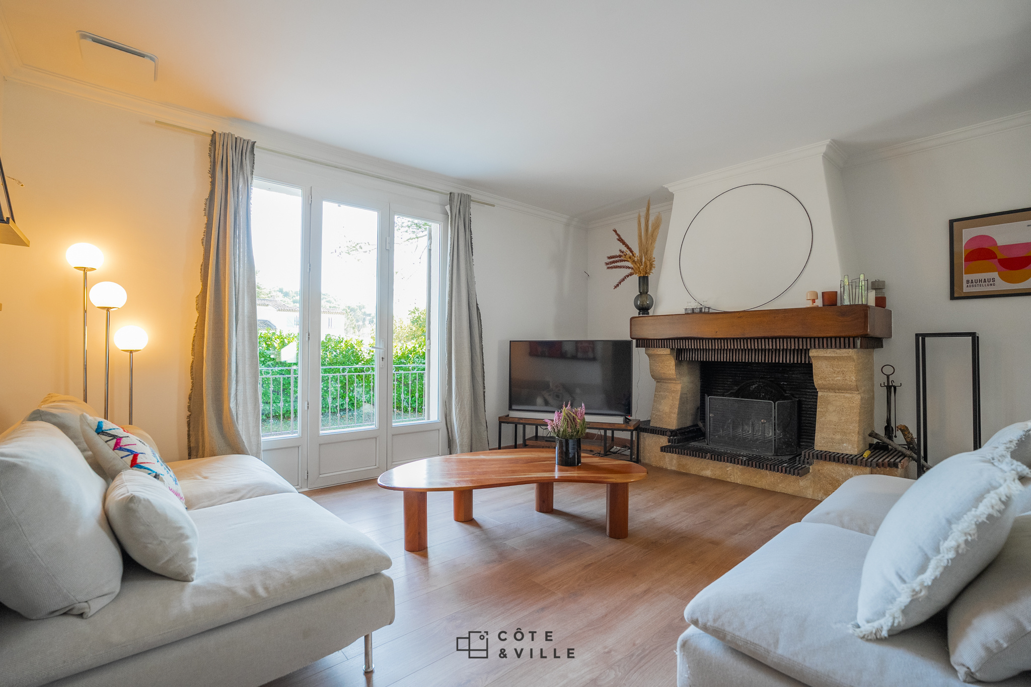 L’entrée s’ouvre sur un séjour avec cheminée, baigné de lumière grace à de grandes ouvertures, d’une salle à manger, le tout prolongé par deux belles terrasses .