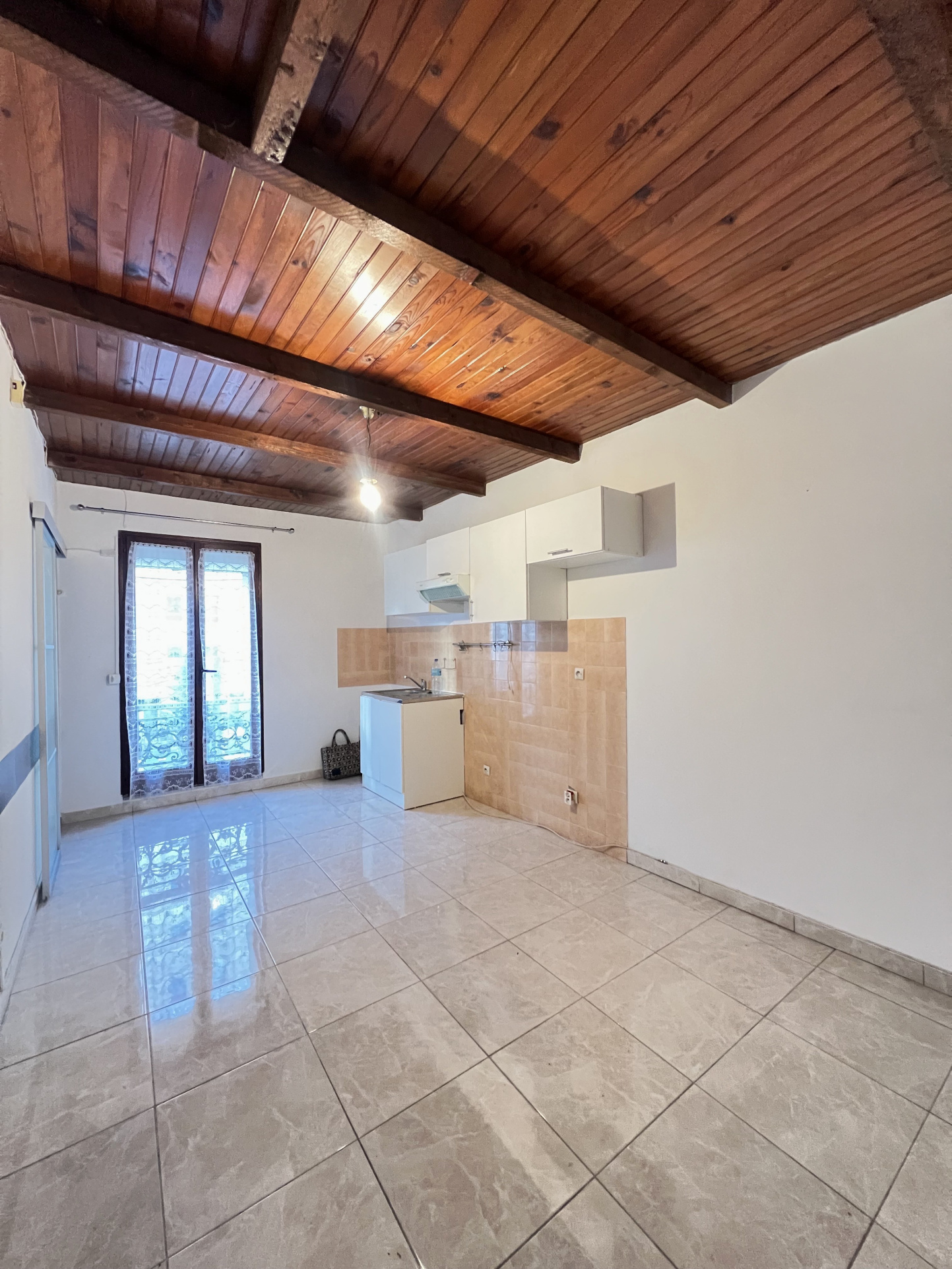 RDC : entrez dans la pièce de vie composée d’une cuisine, un salon, une chambre et une salle de douche en enfilade.