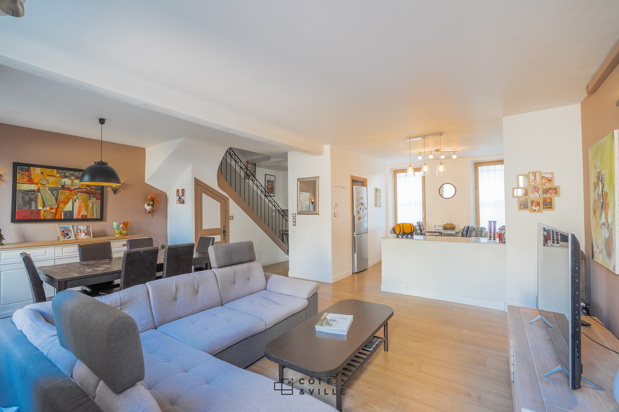 Le niveau principal accueille un vaste séjour, réunissant salon, salle à manger et cuisine ouverte entièrement équipée.