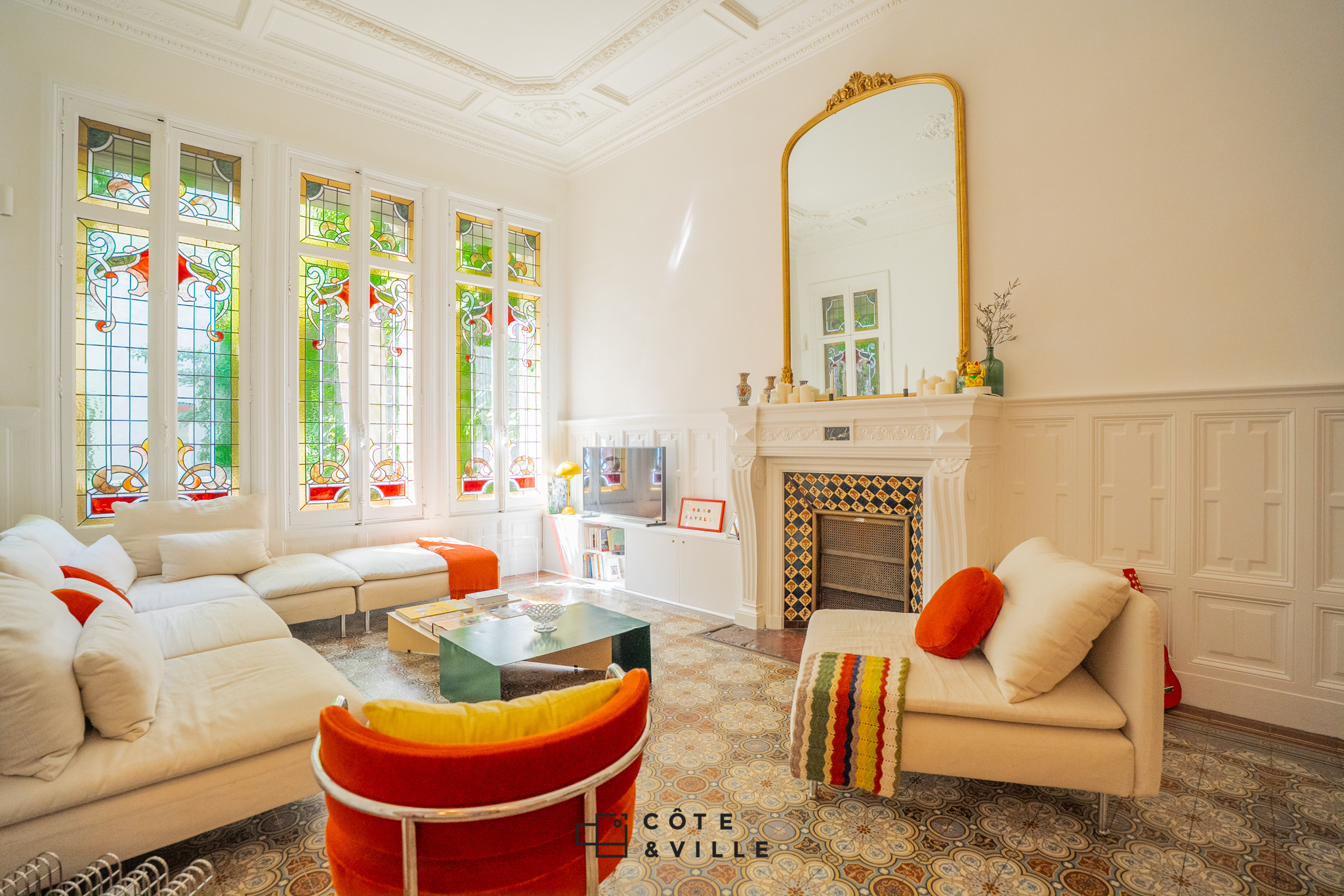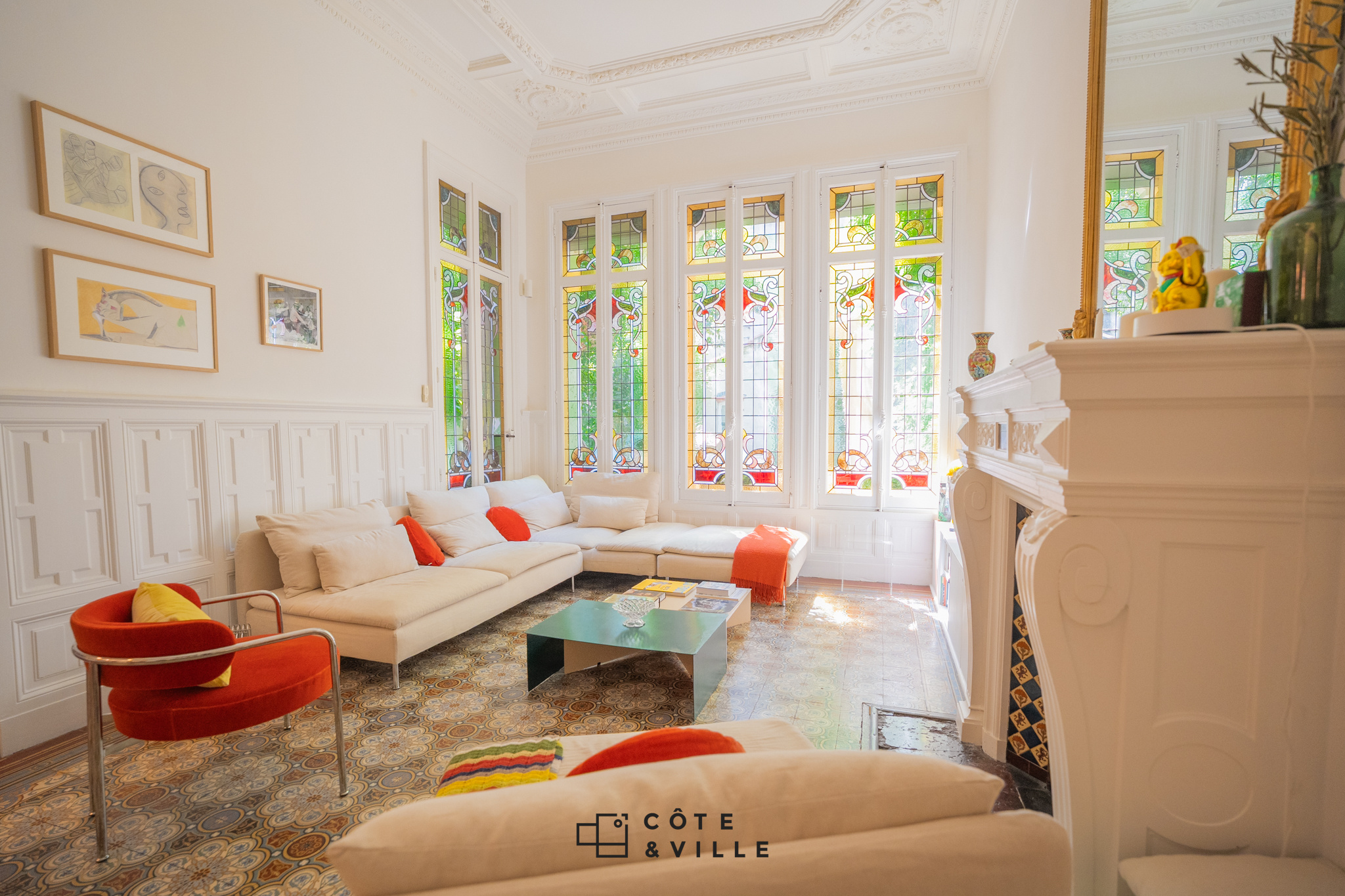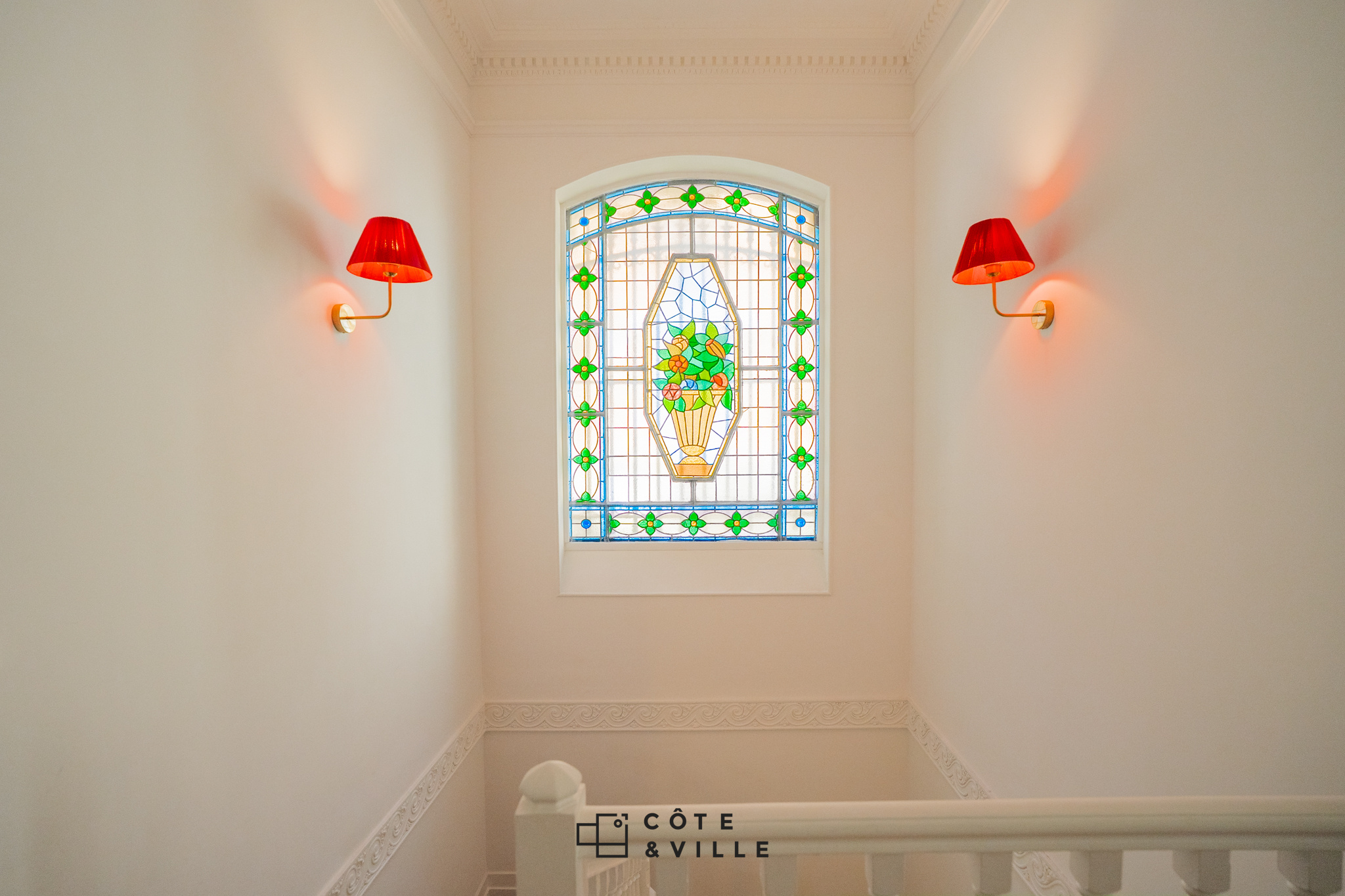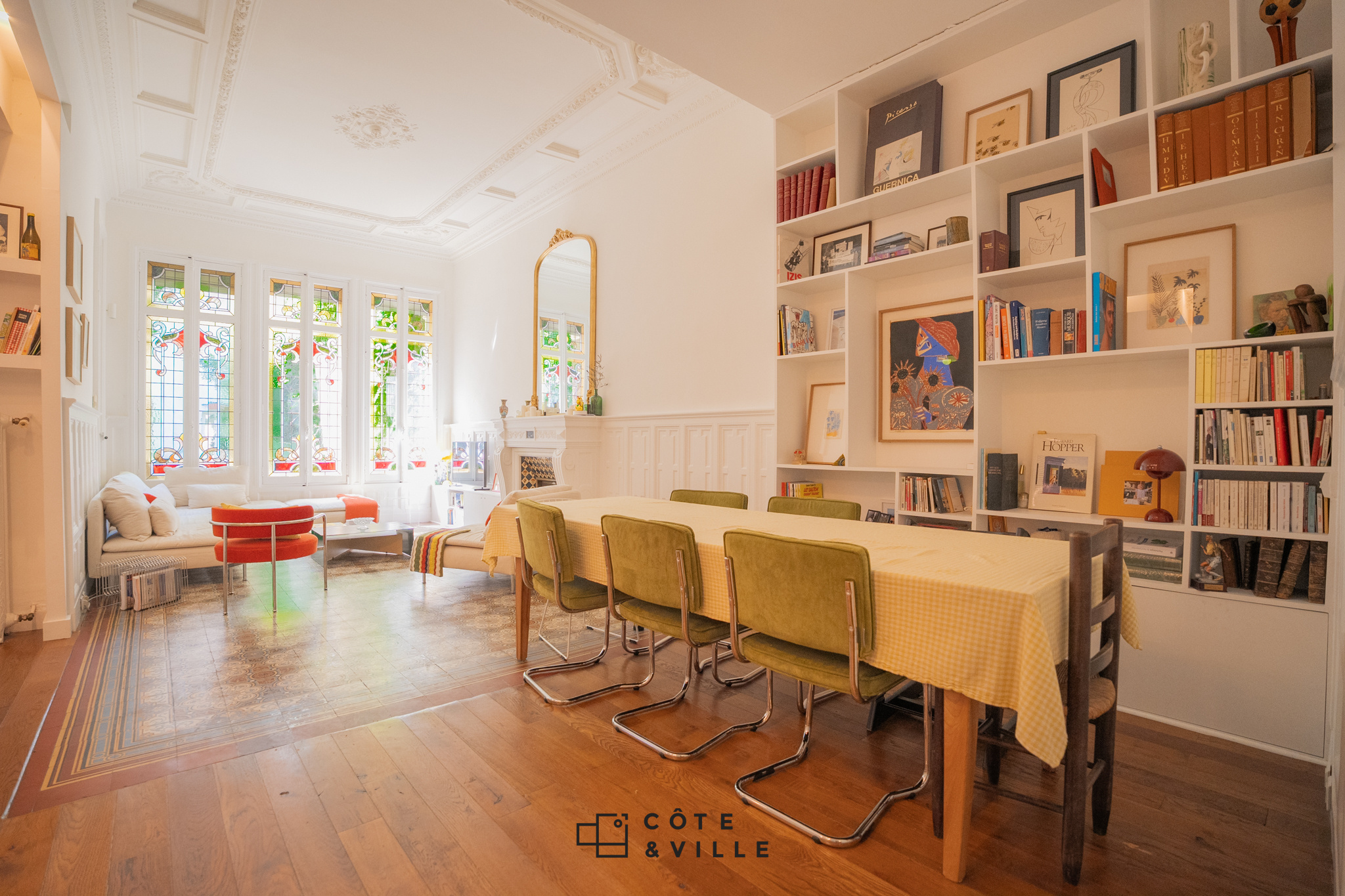 Il se compose d’une spectaculaire pièce de vie avec ses vitraux d’époque de 50m2 donnant sur le jardin avec sa cuisine ouverte entièrement équipée, de 3 chambres spacieuse ( 21m2, 19m2 et 13 m2 ) avec rangements et d’une salle de bain avec baignoire et douche.