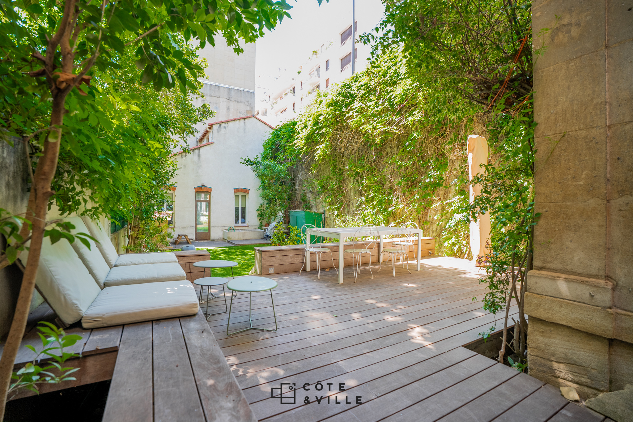 La dépendance quant à elle, de l’autre côté de la propriété, bénéficie d’une entrée indépendante sur la rue adjacente.