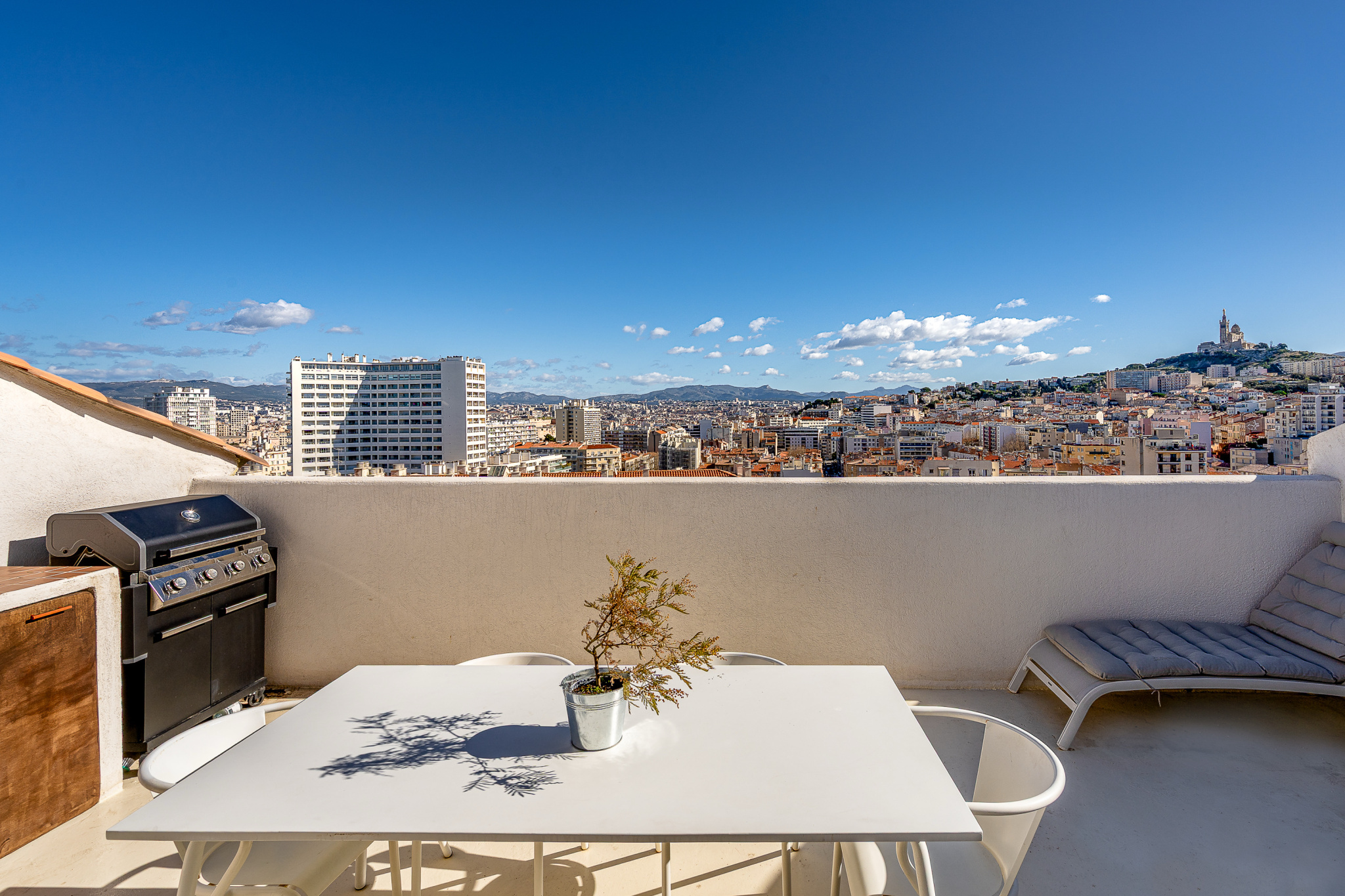La terrasse en roof top avec cuisine dété est au calme absolu et bénéficie une vue dégagée sur Marseille et Notre Dame de la Garde.